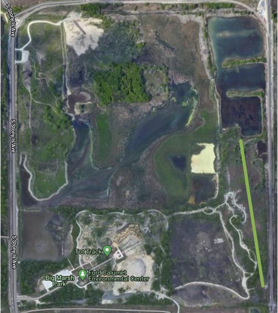 The transect goes from northish to southish on the east side of Big Marsh Park, across what’s affectionately called Mars, because of the unearthly iron-red slag. The transect is about 600m.